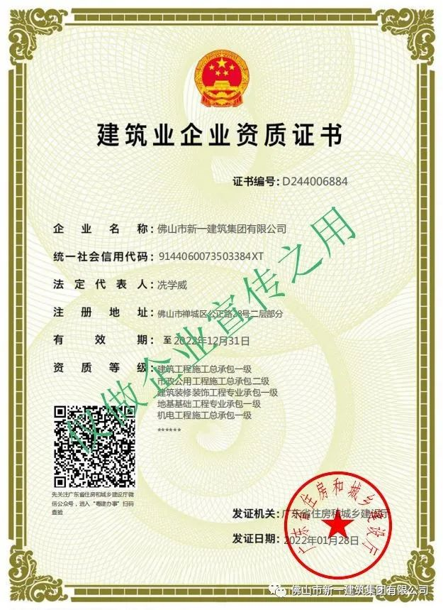 經(jīng)過公司的不懈努力,2022年1月28日,公司成功取得由廣東省住房和城鄉(xiāng)建設(shè)廳核準(zhǔn)頒發(fā)的機(jī)電工程施工總承包壹級(jí)資質(zhì)。