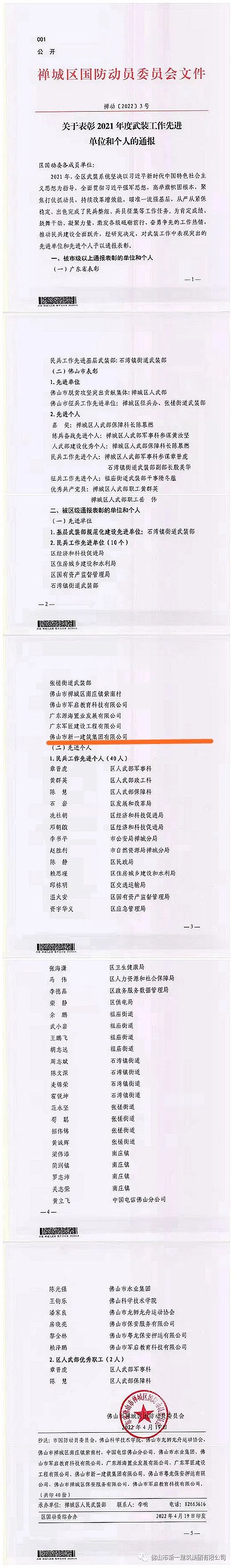 近日,佛山市禪城區(qū)國(guó)防動(dòng)員委員會(huì)下發(fā)了《關(guān)于表彰2021年度武裝工作先進(jìn)單位和個(gè)人的通報(bào)》的文件,我司完成了民兵整組,兵民征集等任務(wù),區(qū)國(guó)防動(dòng)員委員會(huì)由此對(duì)武裝工作中表現(xiàn)突出的先進(jìn)單位進(jìn)行通報(bào)表彰。